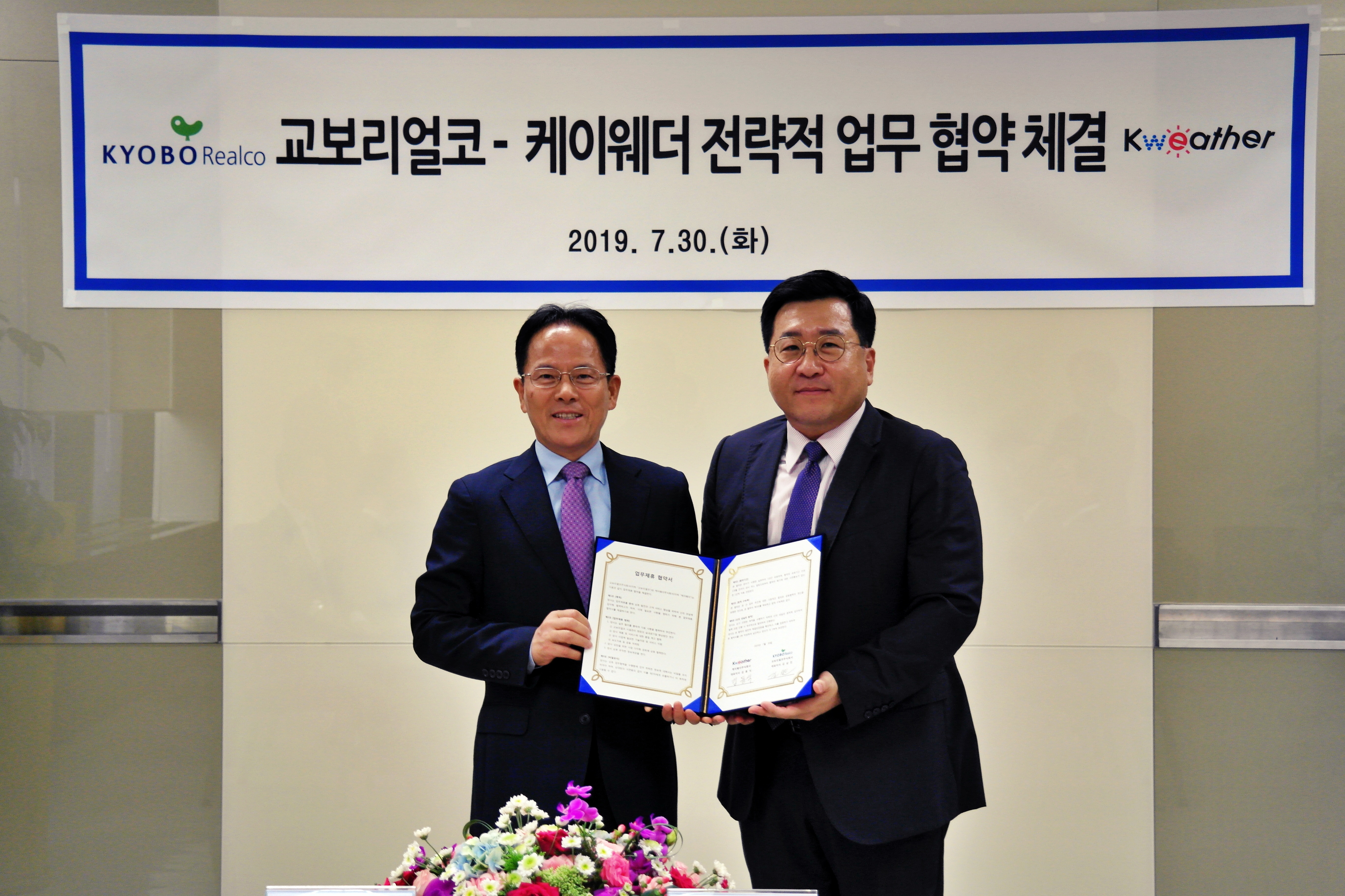 날씨와 공기서비스기업 케이웨더(주)(대표이사 김동식)와 교보리얼코(주)(대표이사 김상진)는 4차 산업혁명 기술을 활용한 실내 공기질 관리를 위해 서울 성동구 교보리얼코 본사에서 업무 협력 양해각서를 체결했다고 1일 밝혔다.