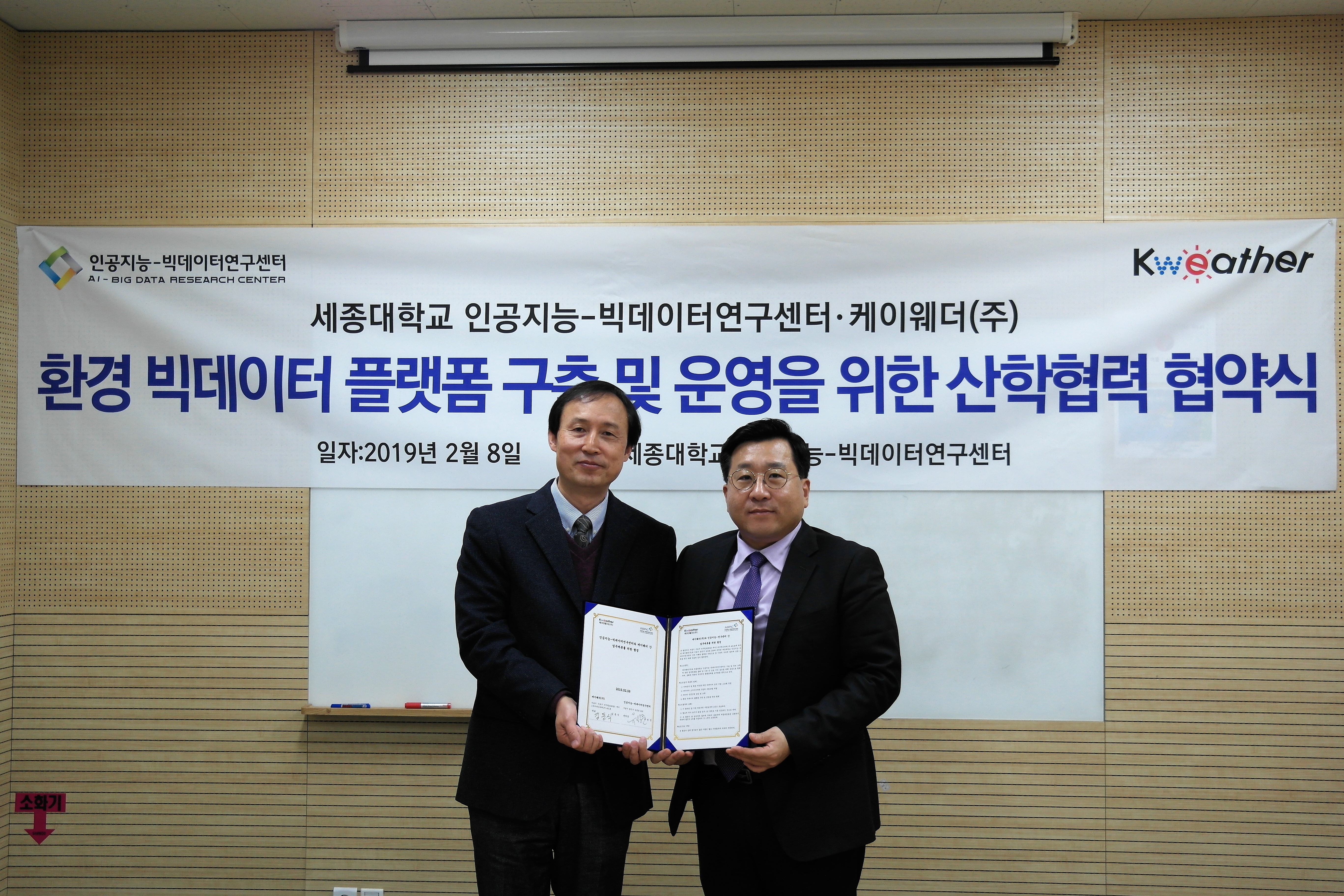 날씨와 공기 서비스기업 케이웨더(대표이사 김동식)와 세종대학교 인공지능-빅데이터연구센터(센터장 유성준)는 지난 8일 세종대학교 학술정보관 7층 대회의실에서 ‘빅데이터 플랫폼 구축 및 운영’을 위한 업무 협약식을 했다고 14일 밝혔다.