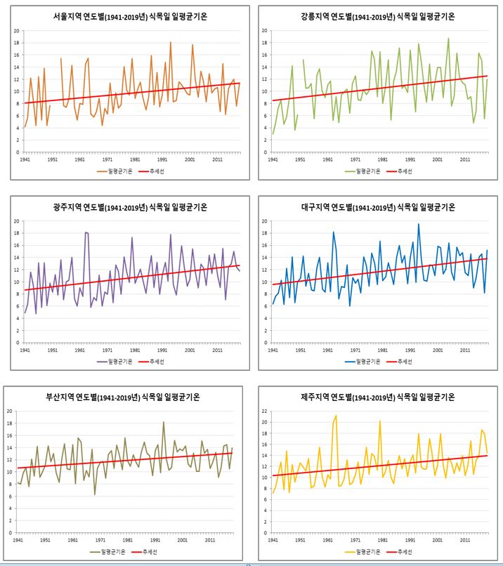 ▫ 6개 도시(서울, 강릉, 광주, 대구, 부산, 제주)의 식목일 평균기온을 1940년대부터 2010년대까지 연대별로 분석한 결과,
