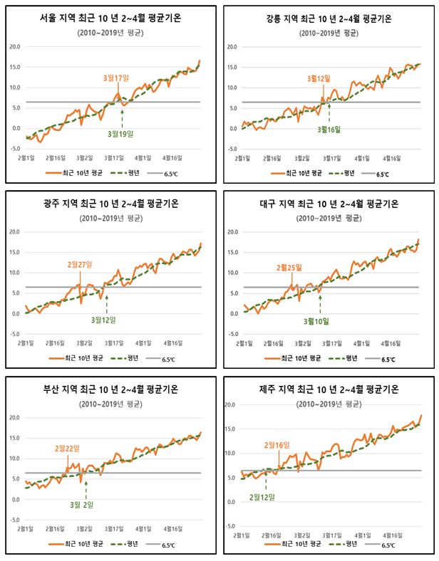 ▫ 6개 도시의 2월부터 4월까지의 일평균기온을 최근 10년간 평균 내어 분석한 결과, 일 평균기온 6.5℃를 기록하는 시점이 평년보다 더 빨라지고 있음(첨부자료 3.참고).