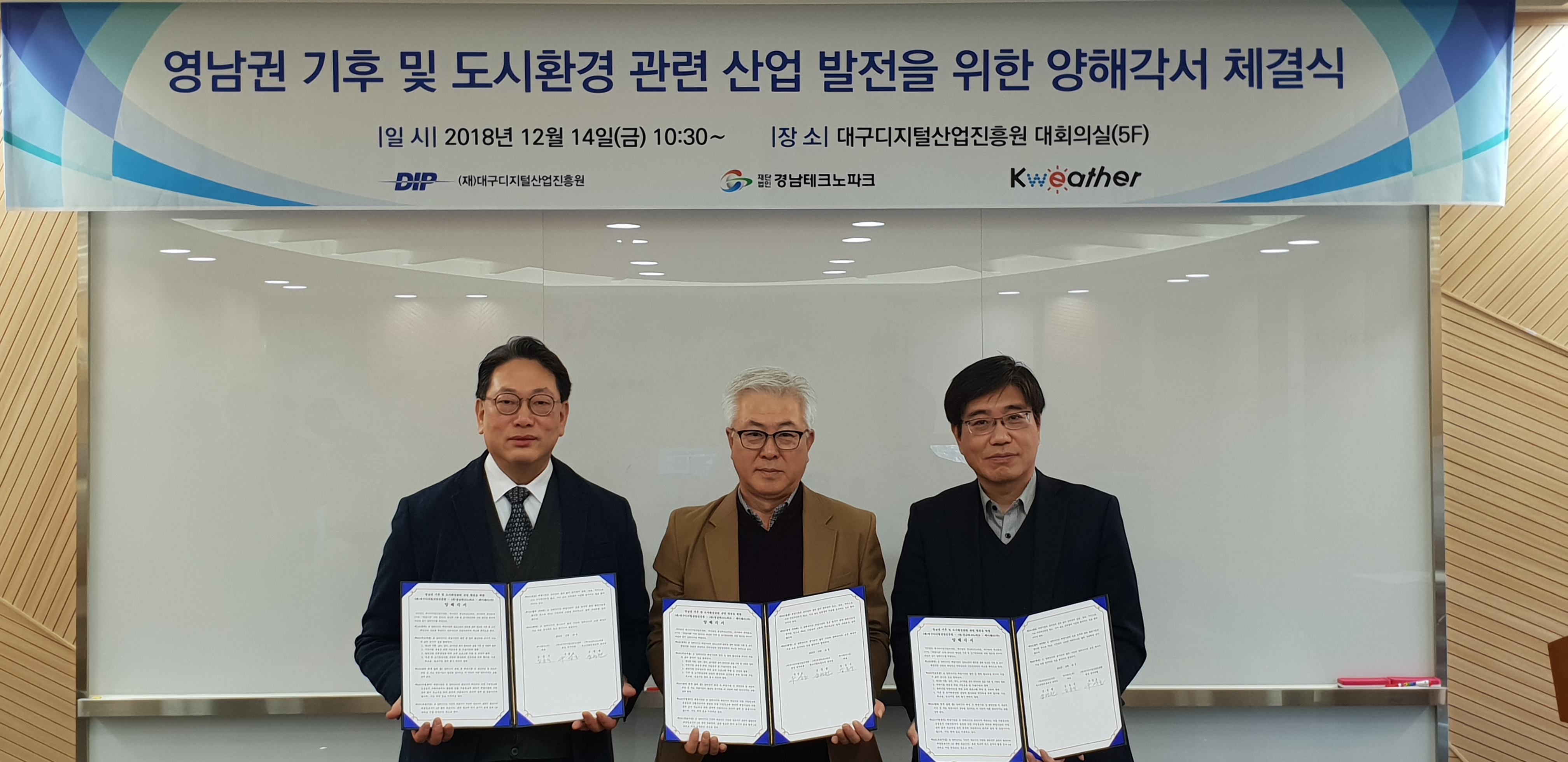 케이웨더와 (재)경남테크노파크 정보산업진흥본부, (재)대구디지털산업진흥원은 점차 심각해지는 도시환경 분야의 문제점 해결을 목적으로 영남권 기후, 날씨, 공기, 도시환경 분야 정책과제의 기획 및 수행, 관련 지역기업 육성, 교육 프로그램 개발 등에 대한 공동의 협력체계 구축을 위해 양해각서(MOU)를 체결했다.