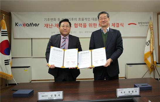 날씨와 공기 서비스기업 케이웨더(대표이사 김동식)와 희망브리지 전국재해구호협회(회장 송필호)는 급격한 기후변화에 따른 기상이변으로 국지성 집중호우 등이 빈번하게 발생하고, 미세먼지가 사회 재난으로 대두됨에 따라 5일 오후 전국재해구호협회 회관 5층 대회의실에서 이상기후의 효율적인 대응과 재난‧재해구호 협력을 위한 업무 협약식을 가졌다.