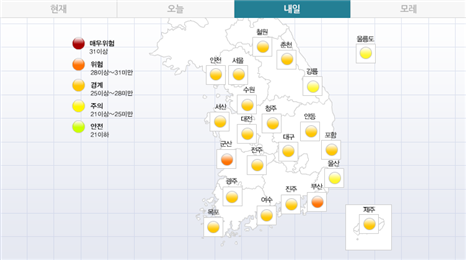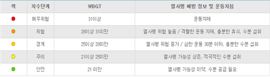 온열지수(WBGT, Wet Bulb Globe Temperature) 실황과 함께 예보를 3시간 단위로 3일간 제공하고 있다.