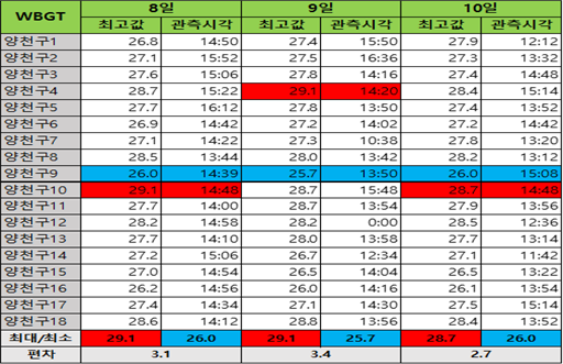 [참고자료 1. 6월 8일(월)~10일(수) 서울시 양천구 온열지수 최고값 관측자료]