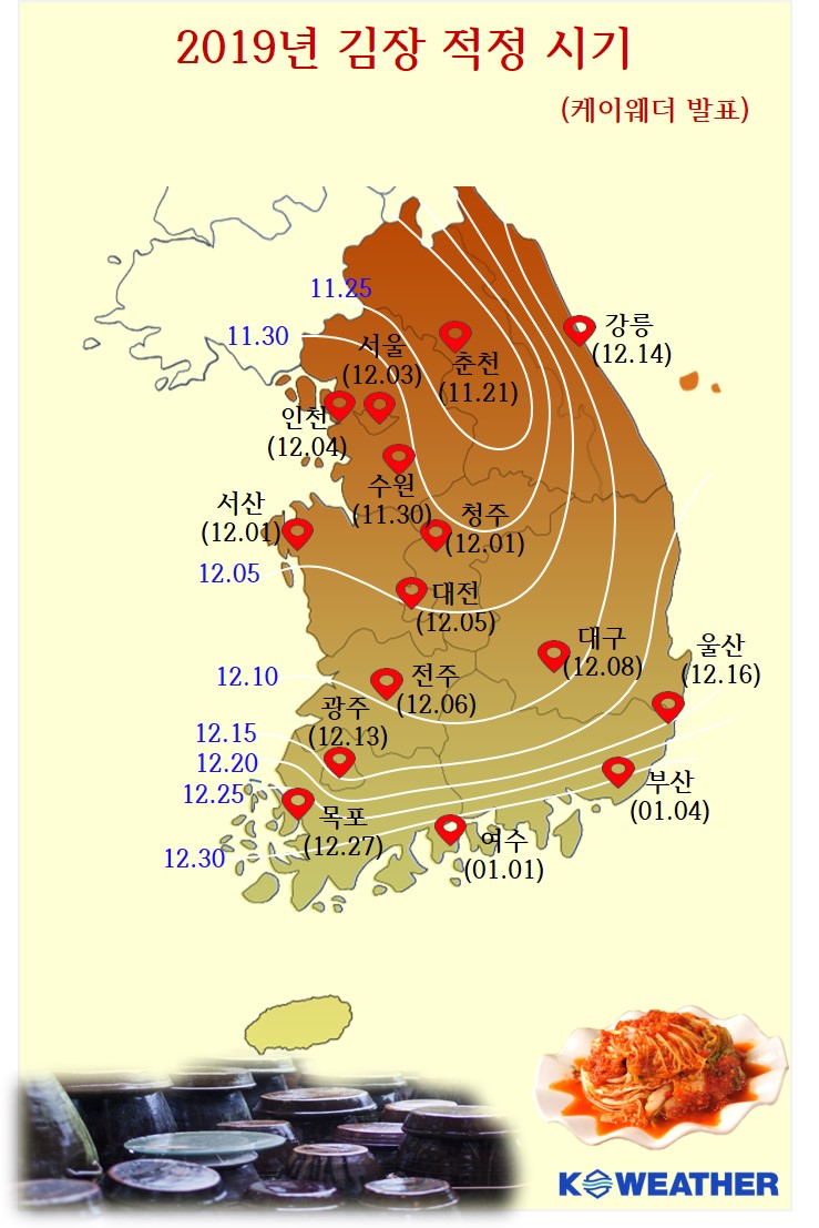 케이웨더 예보센터 올해 김장은 1~2일 빠르게 하세요 서울 11월 27일 / 대전 11월 29일 / 광주 12월 09일 11월 하순과 12월 상순 기온은 평년보다 다소 낮겠음. 최근 지구온난화로 인한 기온상승으로 김장 적정 시기도 늦어지는 추세 ※기상산업진흥법 제 14조 ‘기상정보의 출처 명시 등’에 따라 본 보도자료를 인용하는 경우 반드시 출처 ‘케이웨더’를 명시하여 주시기 바랍니다. |